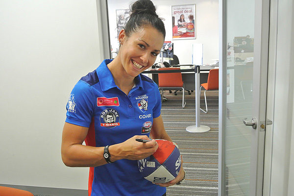 Nicky is autographing a teen fan’s football. ‘How do you spell her name?’ she asks with a hint of sunburnt country, enough to know Bulldogs’ number 10 is unpretentious and down to earth.