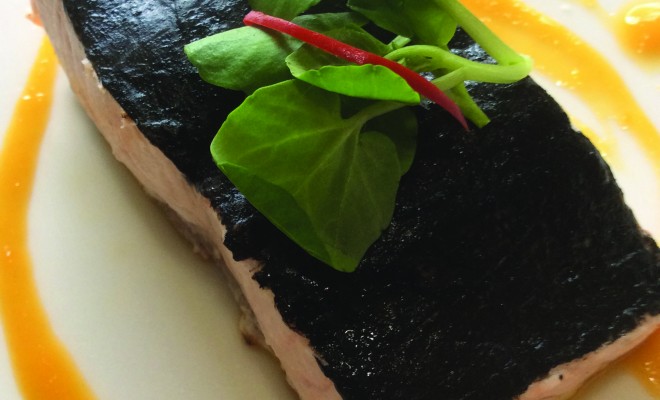 Remove the salmon to a board and allow to cool slightly before painting a thin film of squid ink onto the top of the salmon.