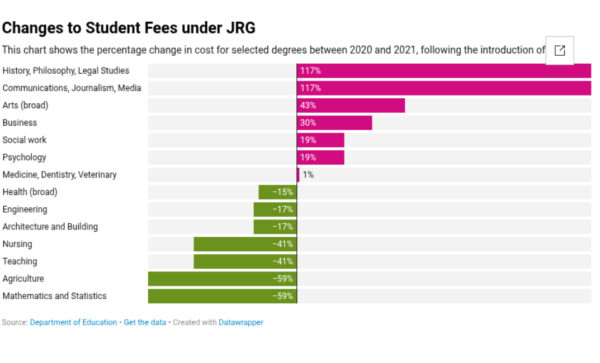 Introduced in 2020 by Scott Morrison’s federal Coalition government, JRG lowered the tuition cost for supposed ‘high demand’ degrees and raised the price for ‘low demand’ ones.