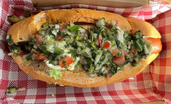 Completo – Sauerkraut, mashed avocados, diced tomatoes, mayonnaise, and salsa Chilena – Chilean Independence Day Special (One Day Only). $14.00