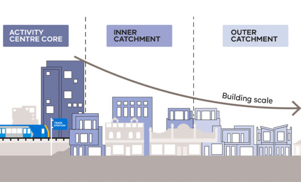 The Activity Centres Program (AC Program) overrides council planning rules in order to open up high rise construction of up to 12 storeys close to train lines, transitioning to three to six storey buildings as the plan extends 800m out into the surrounding area.